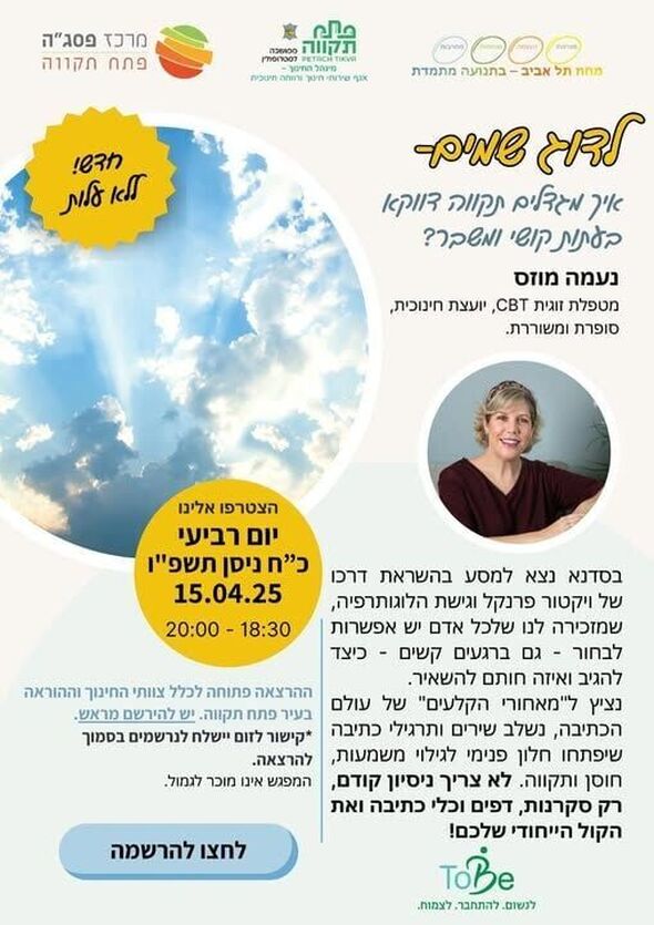 מרכז פסג"ה בפתח תקווה יקיים ביום רביעי הקרוב, 15 באפריל, סדנה מקוונת והרצאה תחת הכותרת "לדוג שמים - איך מגדלים תקווה בעתות קושי ומשבר". המפגש פתוח לכלל צוותי החינוך וההוראה בעיר ומוצע ללא עלות.