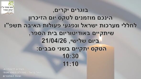 בית הספר השש-שנתי ע"ש יצחק שמיר בפתח תקווה מזמין את בוגריו להשתתף בטקס יום הזיכרון לחללי מערכות ישראל ונפגעי פעולות האיבה לשנת תשפ"ו.