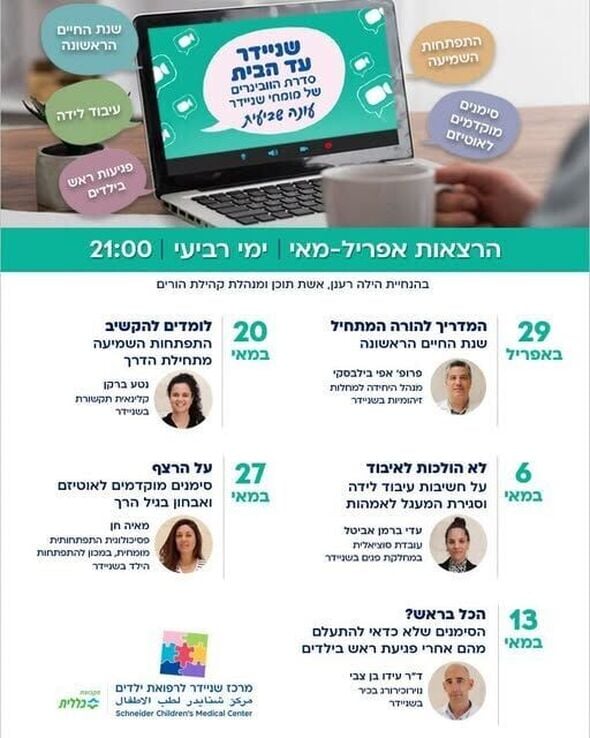 - 20 במאי: "לומדים להקשיב - התפתחות השמיעה מתחילת הדרך" מפי נטע ברקן, קלינאית תקשורת בשניידר.