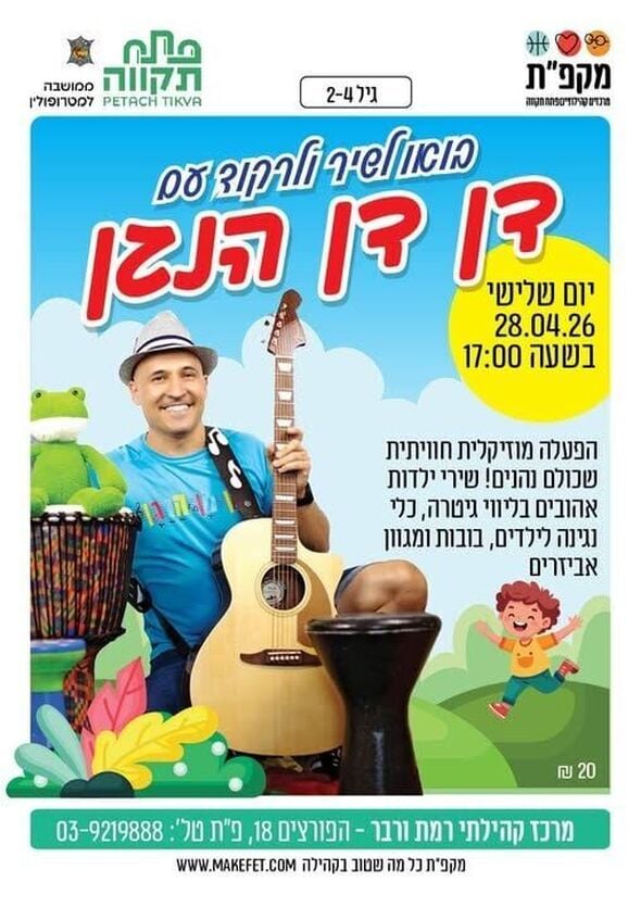 מופע מוזיקלי לילדים: "דן דן הנגן" במרכז הקהילתי רמת ורבר בפתח תקווה ב-28.04.26