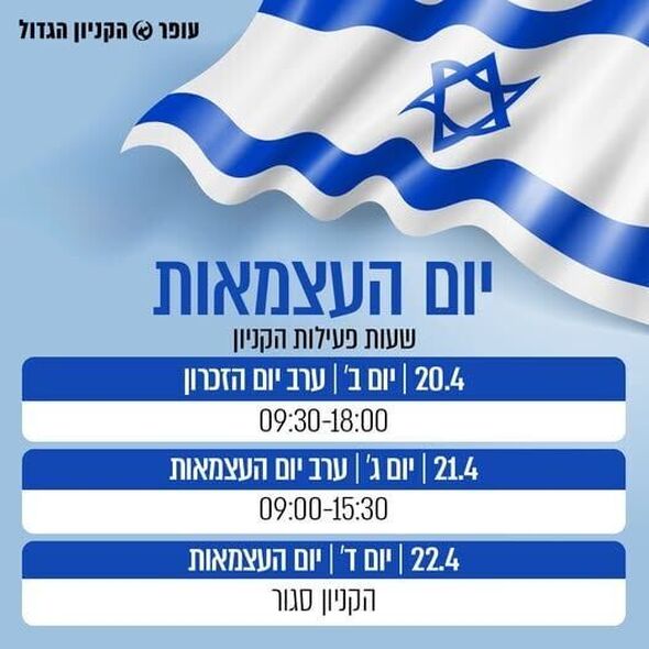 - יום רביעי, 22 באפריל (יום העצמאות): הקניון יהיה סגור.