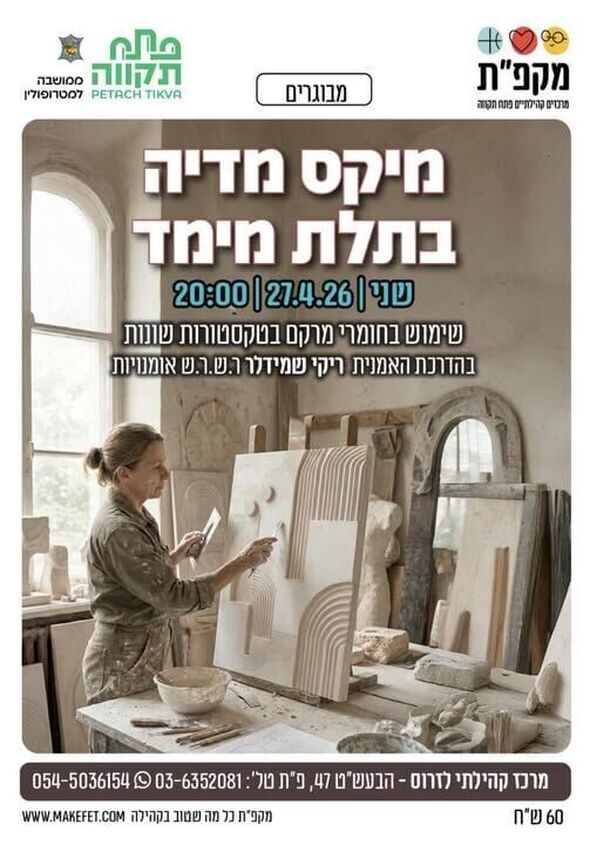 מרכז קהילתי לזרוס בפתח תקווה (רשת מקפ"ת) מזמין את תושבי העיר, בדגש על קהל המבוגרים, להשתתף בסדנת אמנות ייחודית בנושא "מיקס מדיה בתלת מימד". האירוע יתקיים ביום שני, ה-27 באפריל 2026, בשעה 20:00.