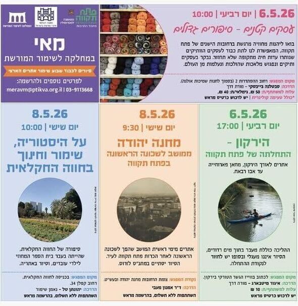 המחלקה לשימור המורשת בעיריית פתח תקווה תקיים במהלך חודש מאי את אירועי "שבוע שימור אתרים". במסגרת הפעילות, יתקיימו ארבעה סיורים מודרכים ברחבי העיר המציעים הצצה מרתקת להיסטוריה, לעסקים הוותיקים ולמורשת המקומית.