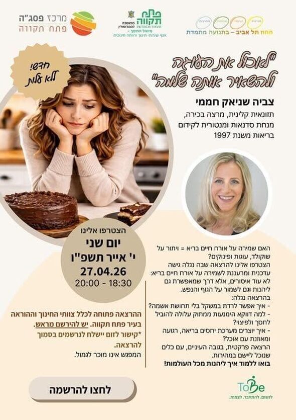 מרכז פסג"ה פתח תקווה מזמין את כלל צוותי החינוך וההוראה בעיר להרצאה מקוונת בנושא אורח חיים בריא, תחת הכותרת "לאכול את העוגה ולהשאיר אותה שלמה". ההרצאה תתקיים ביום שני הקרוב, 27 באפריל 2026 (י' באייר תשפ"ו), בין השעות 18:30 ל-20:00, צפויה להתקיים באמצעות אפליקציית זום.