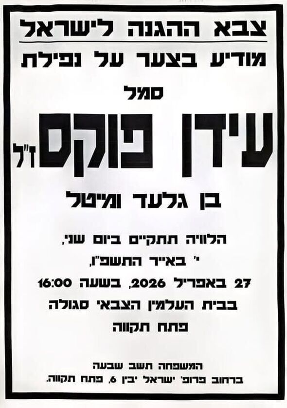 הותר לפרסום כי סמל עידן פוקס ז"ל, בנם של גלעד ומיטל, נפל במערכה בלבנון. הלווייתו תערך היום (שני, י' באייר התשפ"ו, 27 באפריל 2026), בשעה 16:00, בבית העלמין הצבאי סגולה שבפתח תקווה.