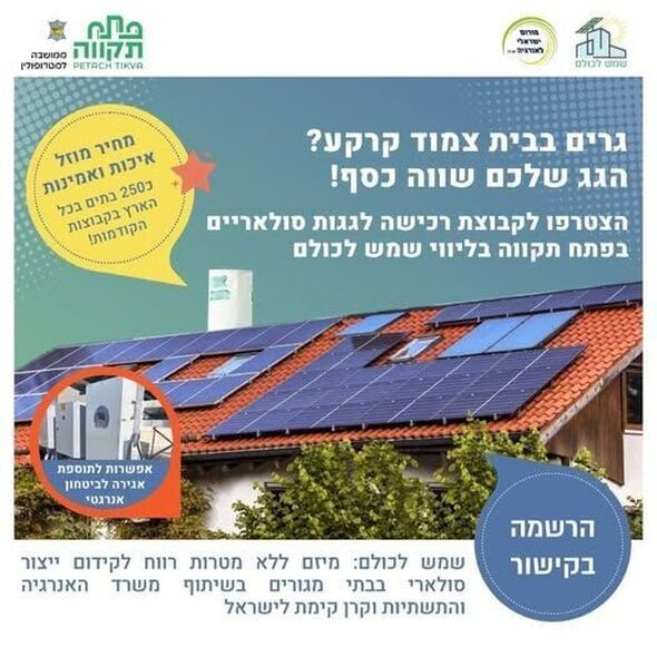 עיריית פתח תקווה קוראת לתושבי העיר המתגוררים בבתים צמודי קרקע להצטרף למיזם התקנת גגות סולאריים, במסגרת קבוצת הרכישה של "שמש לכולם". המיזם, הפועל ללא מטרות רווח ובשיתוף משרד האנרגיה והתשתיות וקרן קיימת לישראל, נועד לקדם ייצור סולארי בבתי מגורים בעיר ולתרום לאיפוס חשבון החשמל ולחיזוק הביטחון האנרגטי של התושבים.