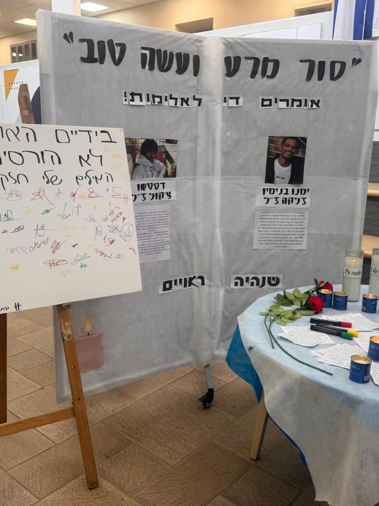 ביום שלישי (28 באפריל 2026), במהלך ההפסקה, התאספו תלמידי התיכון מול מיצג הזיכרון, אשר נשא את הכיתוב "סור מרע ועשה טוב - אומרים די לאלימות!" וכלל נרות נשמה ותמונות של קורבנות אלימות. התלמידים הוסיפו את חתימתם האישית על גבי אמנה למאבק באלימות, וכן על לוח החתמות שעליו נכתב "בידיים האלו אני לא הורסים".