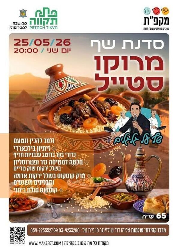 עיריית פתח תקווה ורשת מקפ"ת מזמינות את התושבים לערב ייחודי המשלב אוכל והומור תחת הכותרת "לבשל ולצחוק". ביום שני, ה-25 במאי 2026, תתקיים סדנת שף מרוקאי סטייל. הסדנה תלווה במופע סטנד-אפ קולינרי של השף יהב קריטי ("שף על גלגלים"), המבטיח ערב של טעמים והרבה שמח.