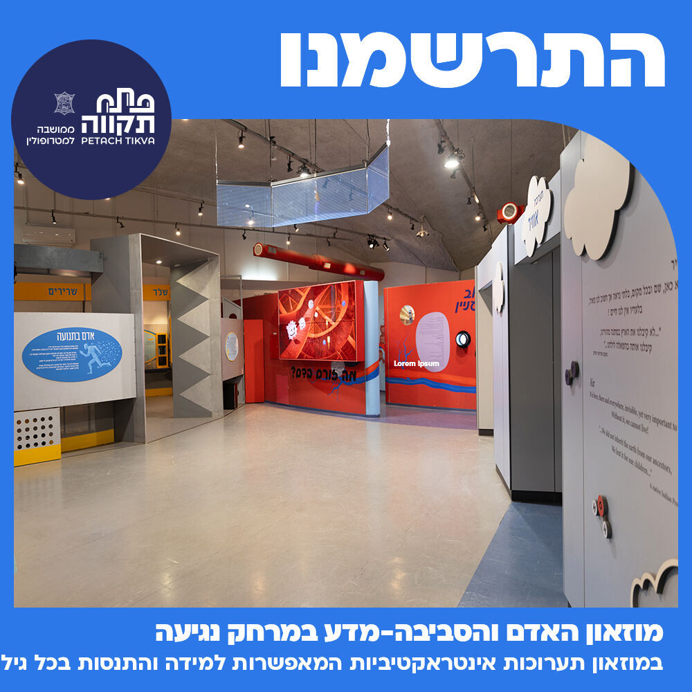 במוזאון האדם והסביבה מציעים תערוכות אינטראקטיביות המאפשרות למידה והתנסות בכל גיל. המוזאון פתוח בימים ב'-ה' בין השעות 10:00-14:00 ובימים ג', ד' בין השעות 16:00-19:00. יש להירשם מראש בטלפון: 03-9286900.