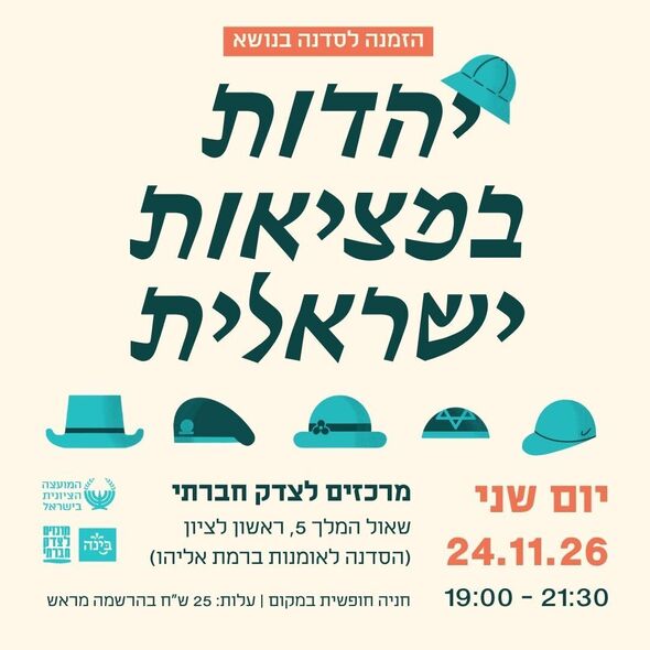 המרכזים לצדק חברתי והמועצה הציונית בישראל מזמינים לסדנה בנושא 'יהדות במציאות ישראלית' שתתקיים בראשון לציון מחר שני 24.11.25 בסדנה לאמנות ברמת אליהו