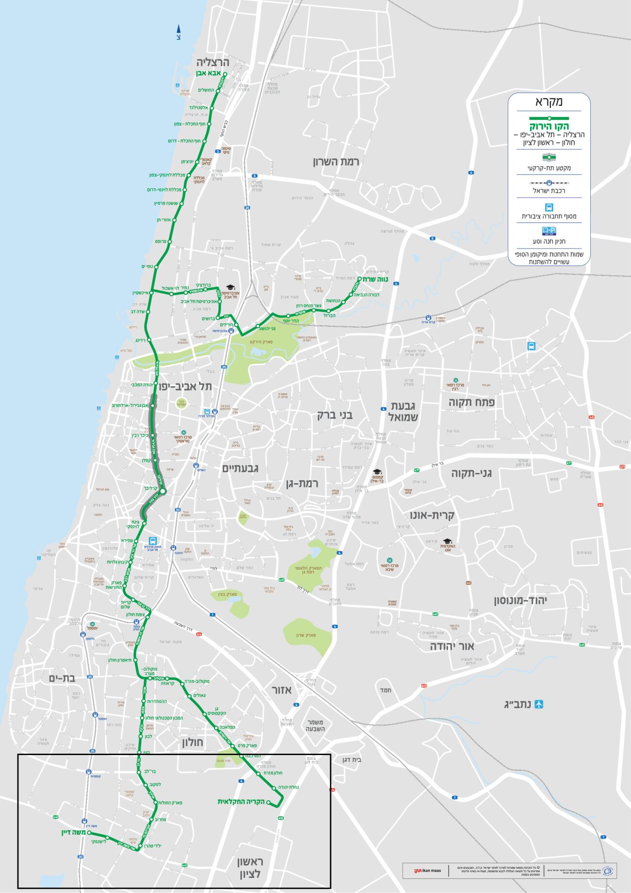 הקו הירוק של הרכבת הקלה עתיד לעבור בין הערים הרצליה, תל אביב, חולון וראשון לציון לאורך 39 ק"מ ו62 תחנות.