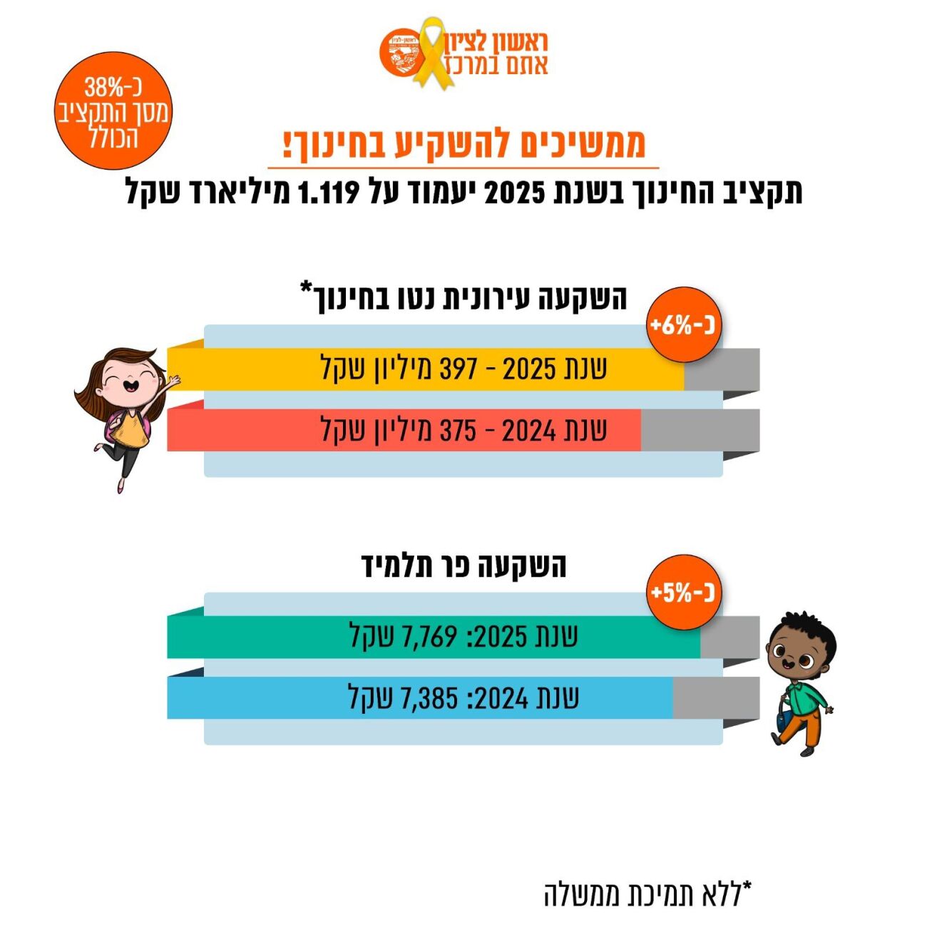 ההשקעה בכל תלמיד ותלמידה בשנת 2025 תעמוד על כ-7,769 שקל לתלמיד – עלייה של 5%, זאת לעומת ההשקעה בתלמיד בתקציב 2024. הדבר מבטא את מחויבות העירייה להמשיך ולהוביל את החינוך בישראל ולהכשיר את תלמידות ותלמידי העיר לאתגרי המחר. כמו כן, ההוצאות לפעולות החינוך יסתכמו בכ-420 מיליון שקל – גידול של כ-17 מיליון שקל מול התקציב המאושר ל-2024.