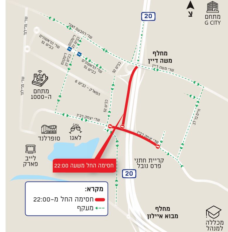 לא תתאפשר תנועת רכבים בדרך שירות יצחר רבין לכיוון דרום באזור מחלף משה דיין