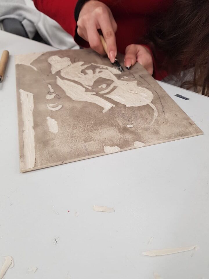 בשלב הבא, התלמידים גילפו את התמונות שציירו על המשטחים, תוך שימוש בטכניקות שונות: אזורים מגולפים לגמרי נצבעו בלבן, אזורים מגולפים חלקית נצבעו באפור, והאזורים שלא מגולפים נצבעו בשחור. התוצאה הייתה תבנית המשמשת כחותמת של פני החטוף. התלמידים צבעו את החותמות והעבירו אותן לנייר באמצעות גלגלת.