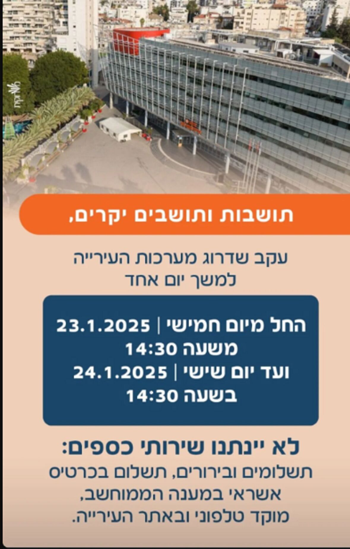 השבתת מערכת התשלומים של עיריית ראשון לציון! החל ממחר בשעות הצהריים (חמישי 23.1) ועד שישי (24.1) לא ניתן יהיה ניתן לבצע פעולות ולקבל שירות בנושא כספים ותשלומים בשל שדרוג מערכות עיריית ראשון לציון