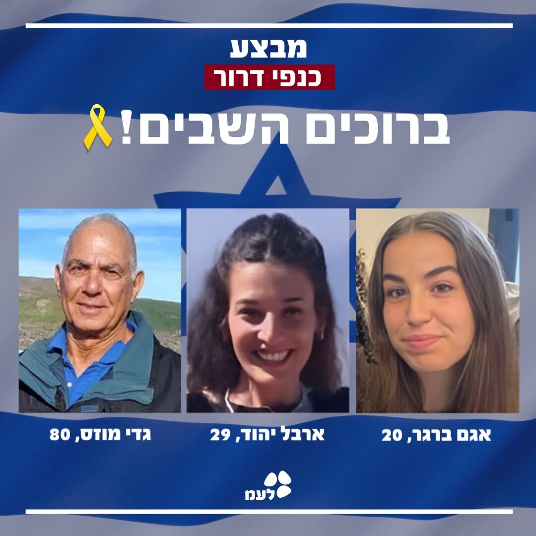 ארבל שלנו הוחזרה. ועם זאת, המשימה שלנו עדיין לא הושלמה. אריאל, בן זוגה של ארבל, עדיין מוחזק בשבי בעזה. וכך גם דוד אחיו, סשה החבר הטוב, שאר חטופי ניר עוז, וכל האהובים כולם. אנחנו לא נרפה עד שכל בני הערובה ישוחררו. אנחנו מפצירים בכולם לא לאפשר לדלת שנפתחה להיסגר. חייבים להשיב את כולם הביתה מיד, כדי שנוכל להשתקם כחברה.