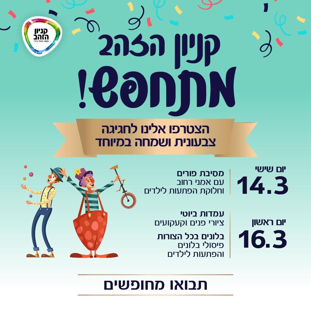 בין התאריכים 14-16.3 תתקיים חגיגת פורים עם ליצנים, הולכי קביים, מאפרת, בלונאי, קוסם, יצירה בגבס