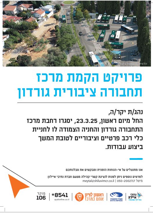 חברת נתיבי איילון הודיעה כי החל מיום ראשון 23.3.25 תיסגר רחבת מרכז התחבורה גורדון והחנייה הצמודה לו לחניית כלי רכב פרטיים וציבוריים - זאת במסגרת העבודות להקמת מסוף התחבורה במקום.