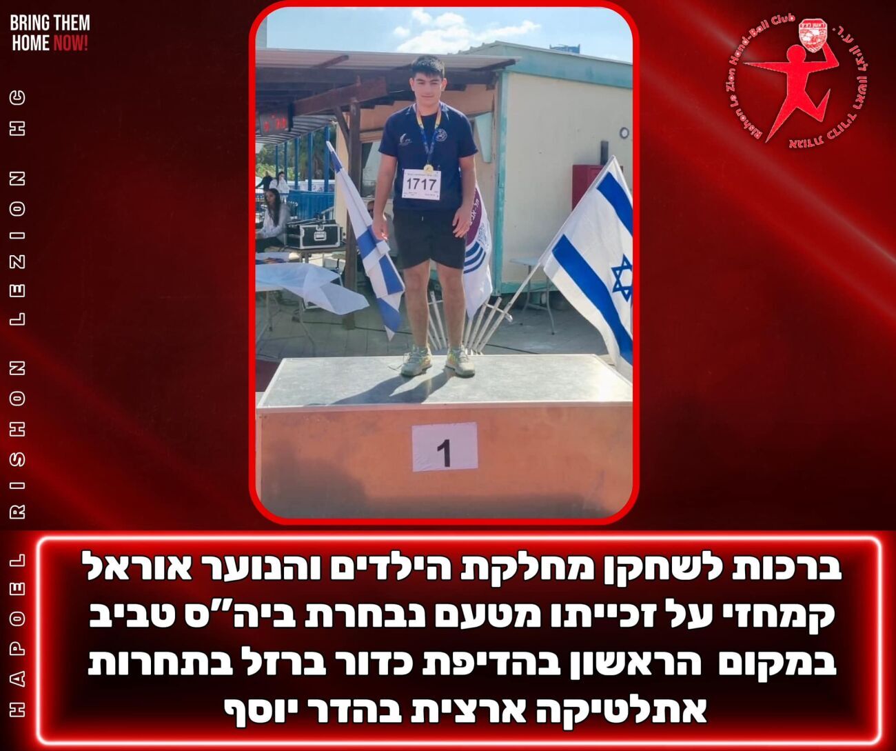 אוראל קמחזי, שחקן מחלקת הילדים והנוער של הפועל ראשון לציון, זכה במקום הראשון בתחרות הדיפת כדור ברזל במסגרת תחרות בתי הספר הארצית שהתקיימה בהדר יוסף. המועדון הביע גאווה רבה בהישגו ואיחל לו הצלחה בהמשך דרכו.