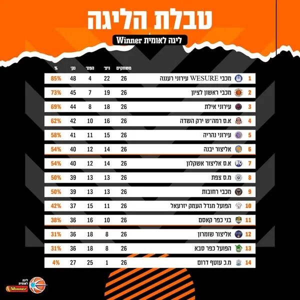 מכבי ראשון לציון בכדורסל סיימה במקום השני בליגה ותתחיל את שלב הבתים ב1.4 מול נהריה