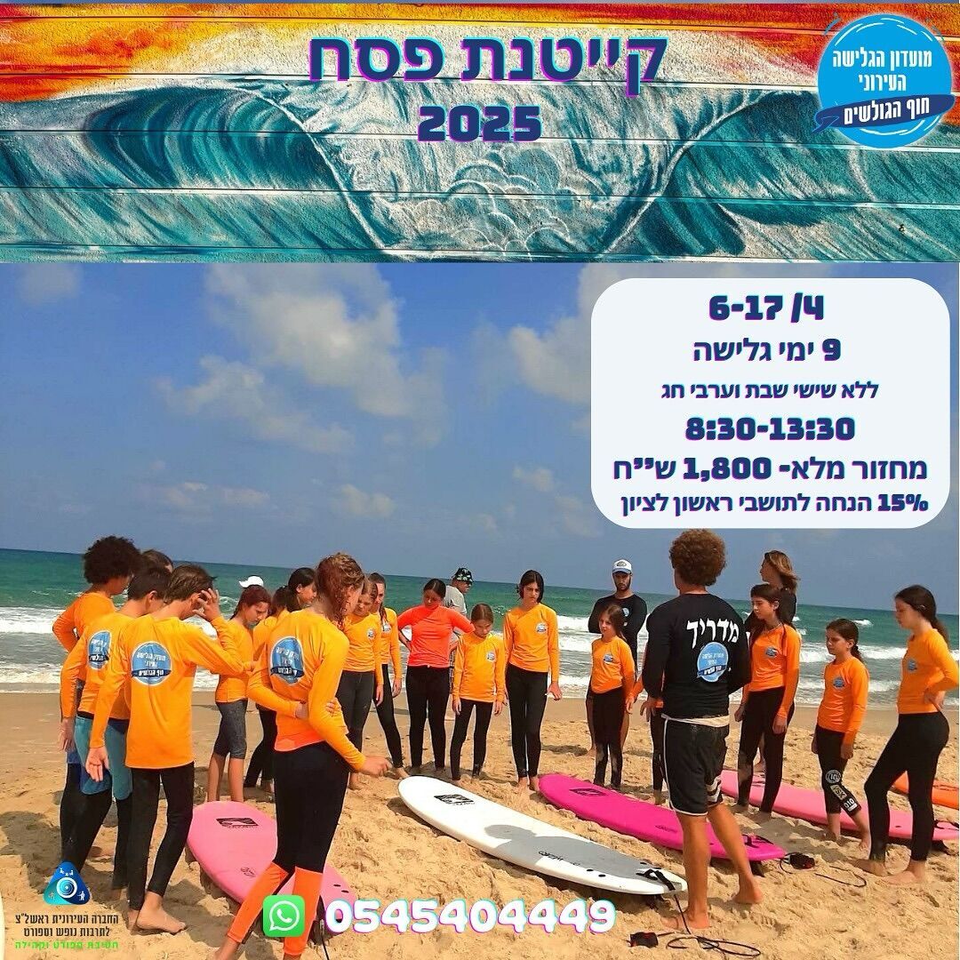 מועדון הגלישה העירוני בחוף הגולשים בראשון לציון מזמין אתכם להשתתף בקייטנת פסח ייחודית ומרגשת. הקייטנה תתקיים במשך שבועיים 6/17-4 ותציע חוויות גלישה, פעילויות ים, וחברותא מהנה. הפעילות מתאימה למתחילים ולגולשים ברמה בינונית ומעלה המעוניינים לשפר את כישוריהם. השנה יושם דגש מיוחד על צילומי וידאו וניתוחם במסגרת שיעורים תאורטיים. מספר המקומות מוגבל, ולכן מומלץ להירשם בהקדם. לפרטים נוספים והרשמה, ניתן למצוא את הקישור בעמוד המועדון.