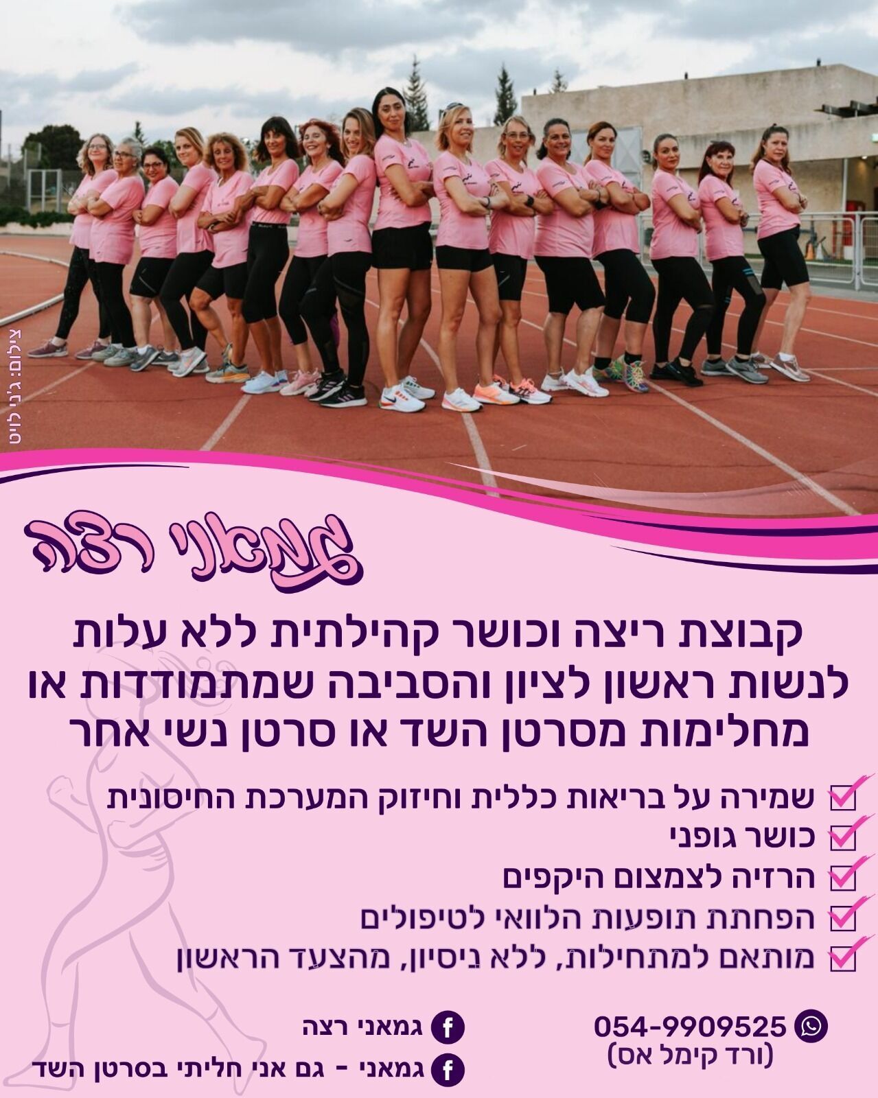 קבוצת ריצה "גמאני רצה" מקצועית למתמודדות ומחלימות מסרטן השד פועלת בראשון לציון במטרה לשפר את סיכויי ההחלמה ולהפחית תופעות לוואי. למעוניינות להצטרף 054-9909525