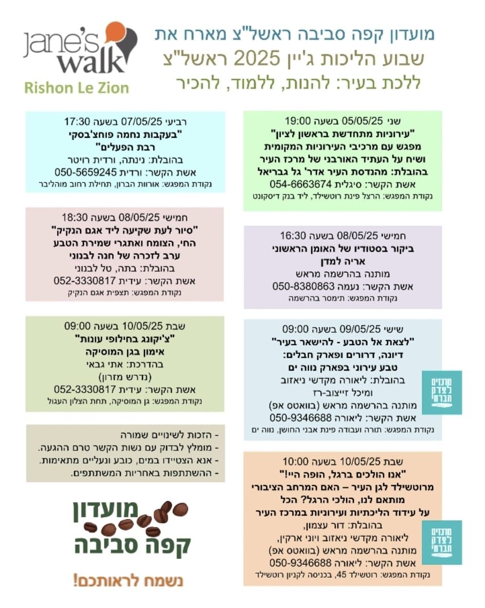 החל ממחר (שני 5.5) יחלו אירועי הליכות ג'יין בראשון לציון הכוללים סיורים באגם הנקיק, סיור על עירוניות ועתיד של מרכז העיר ועוד
