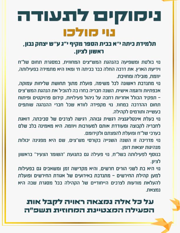 אני גאה לברך את מיכל משען ונוי מולכו – שתי נערות מעוררות השראה, שמהוות דוגמה חיה לכל הבני נוער על מנהיגות צעירה , מחויבות ואחראיות , נתינה ועשייה.