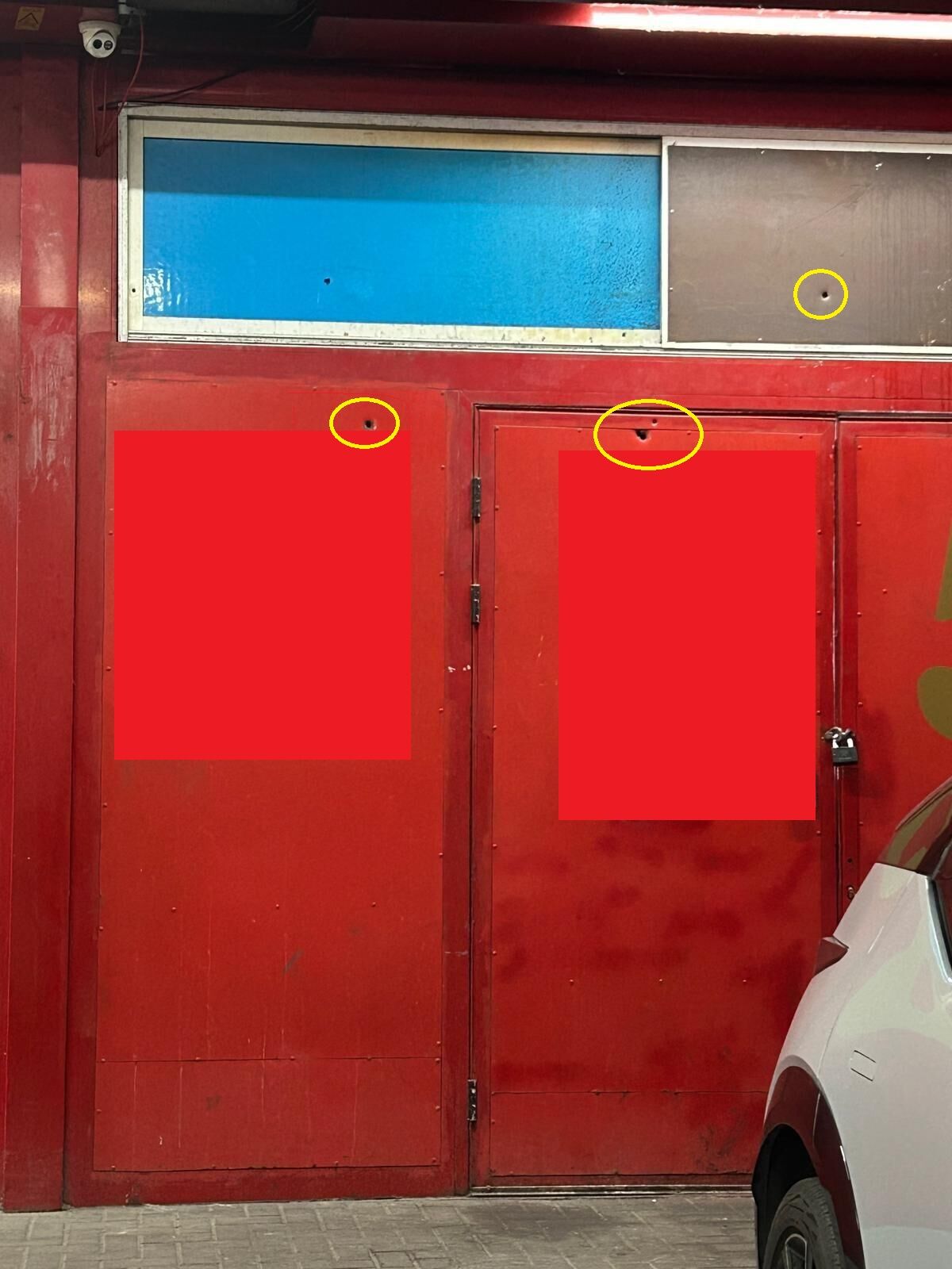 אך סימני חורי הקליעים נראים היטב על דלת בית העסק.