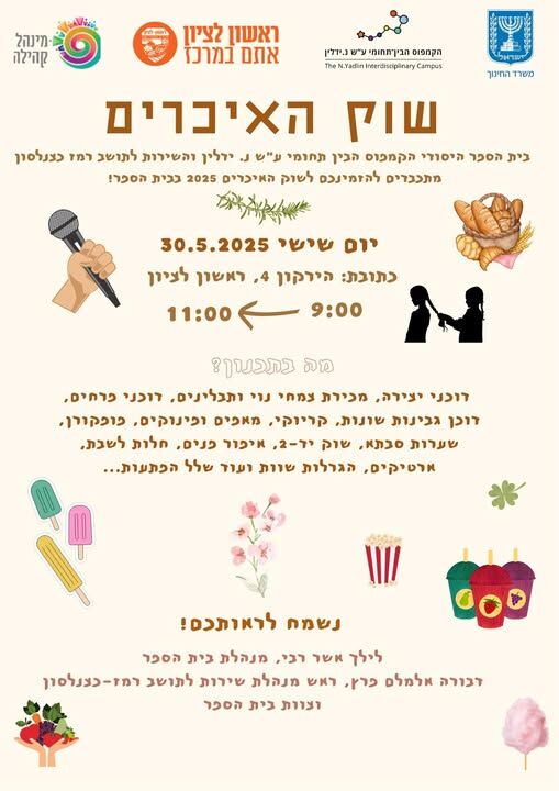 ראשון לציון: ביום שישי 30.5 יתקיים שוק איכרים בבית ספר ידלין עם דוכני יצירה, שוק יד שנייה, גבינות, חלות לשבת ועוד