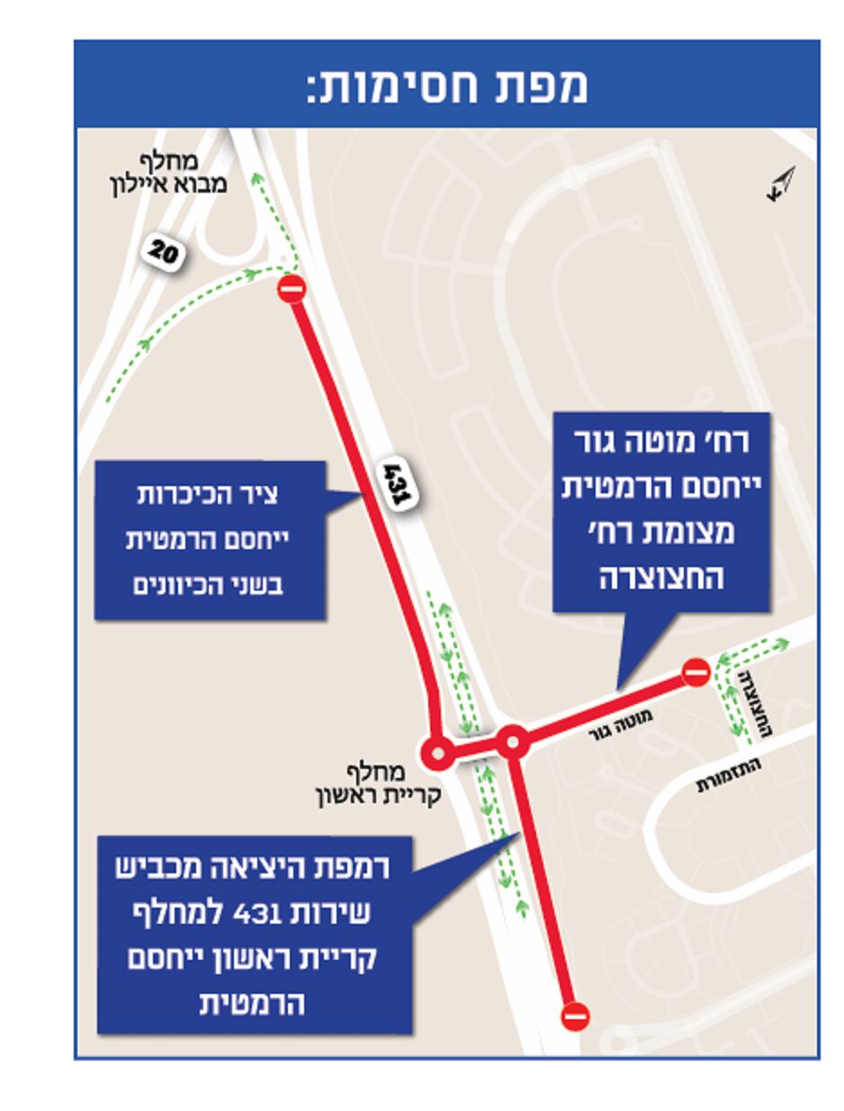 ייחסמו לתנועה ציר הכיכרות ורמפת היציאה מכביש השירות(431) אל מחלף קריית ראשון