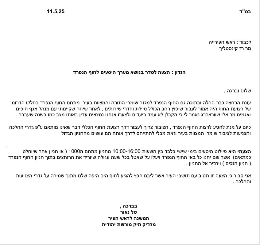 "אני סבור כי הצעה זו תטיב עם תושבי העיר אשר ליבם חפץ להגיע לחוף הים מתוך שמירה על גדרי הצניעות וההלכה" סיכם נאור.