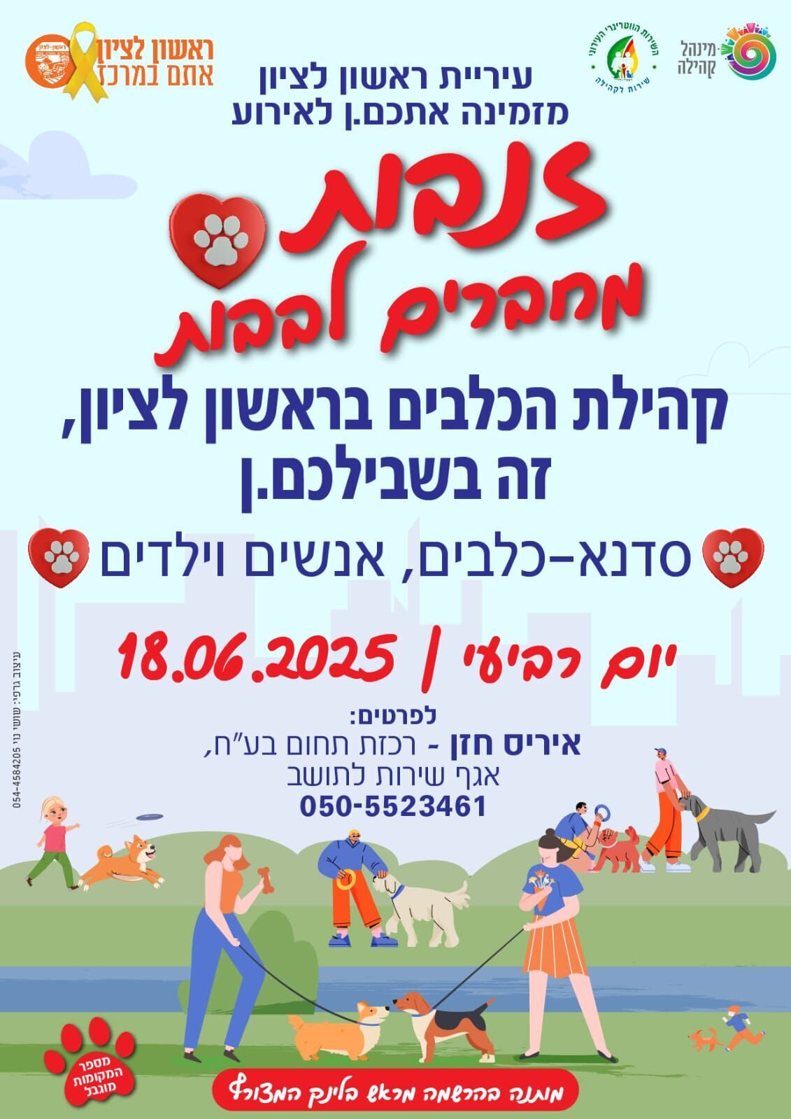 קהילת בעלי ובעלות הכלבים בראשון לציון מוזמנת לאירוע קהילתי מיוחד ומרגש תחת הכותרת "זנבות מחברים לבבות - סדנא לכלבים, אנשים וילדים". האירוע יתקיים ביום רביעי, 18 ביוני 2025, החל מהשעה 18:00 בגינת הכלבים בנווה דקלים בראשון לציון
