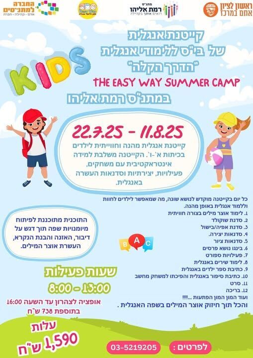 מתנ"ס רמת אליהו בראשון לציון מציג את קייטנת הקיץ "מאסטר שף – טעמים מסביב לעולם" 22/7 - 11/8. הקייטנה מוגדרת כחווייתית ומאתגרת, ומיועדת לילדי כיתות א'-ד'.