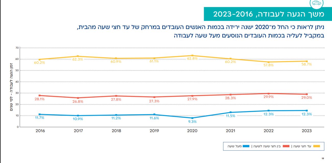 משנת 2020 חלה עלייה באחוז העובדים שנוסעים מעל לשעה לעבודה 9.3% בשנת 2020 לעומת 12.3% בשנת 2023.
