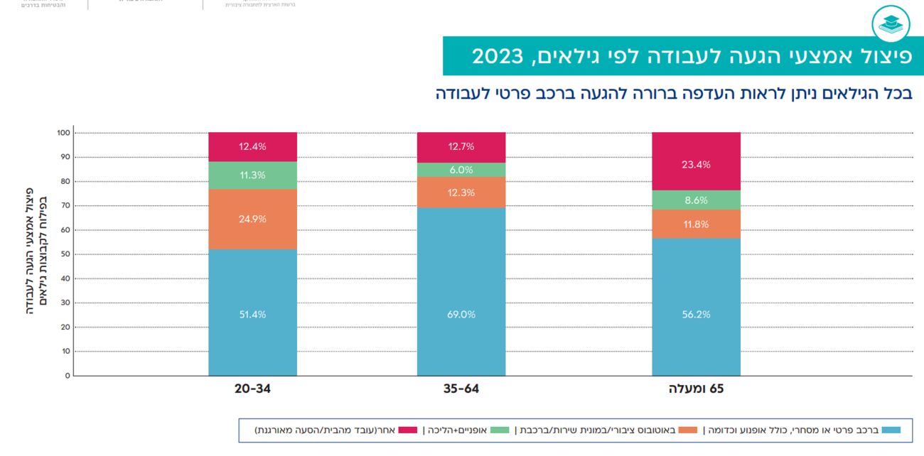 לאורך השנים שנשמרה העדפה לשימוש ברכב פרטי אך משנת 2021 נרשמה ירידה קלה במקביל לעלייה בעבודה מהבית.