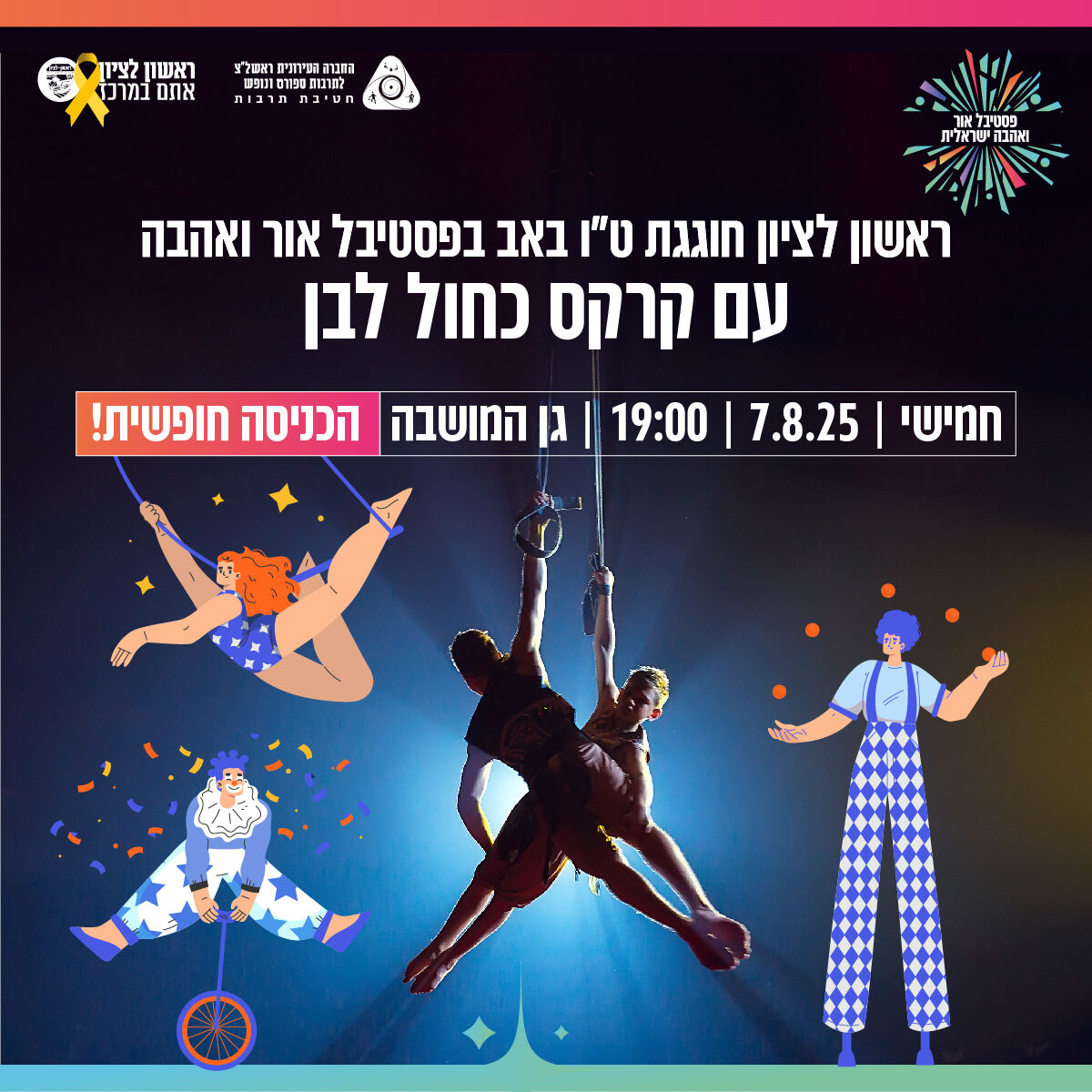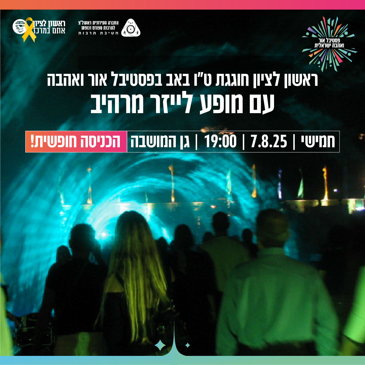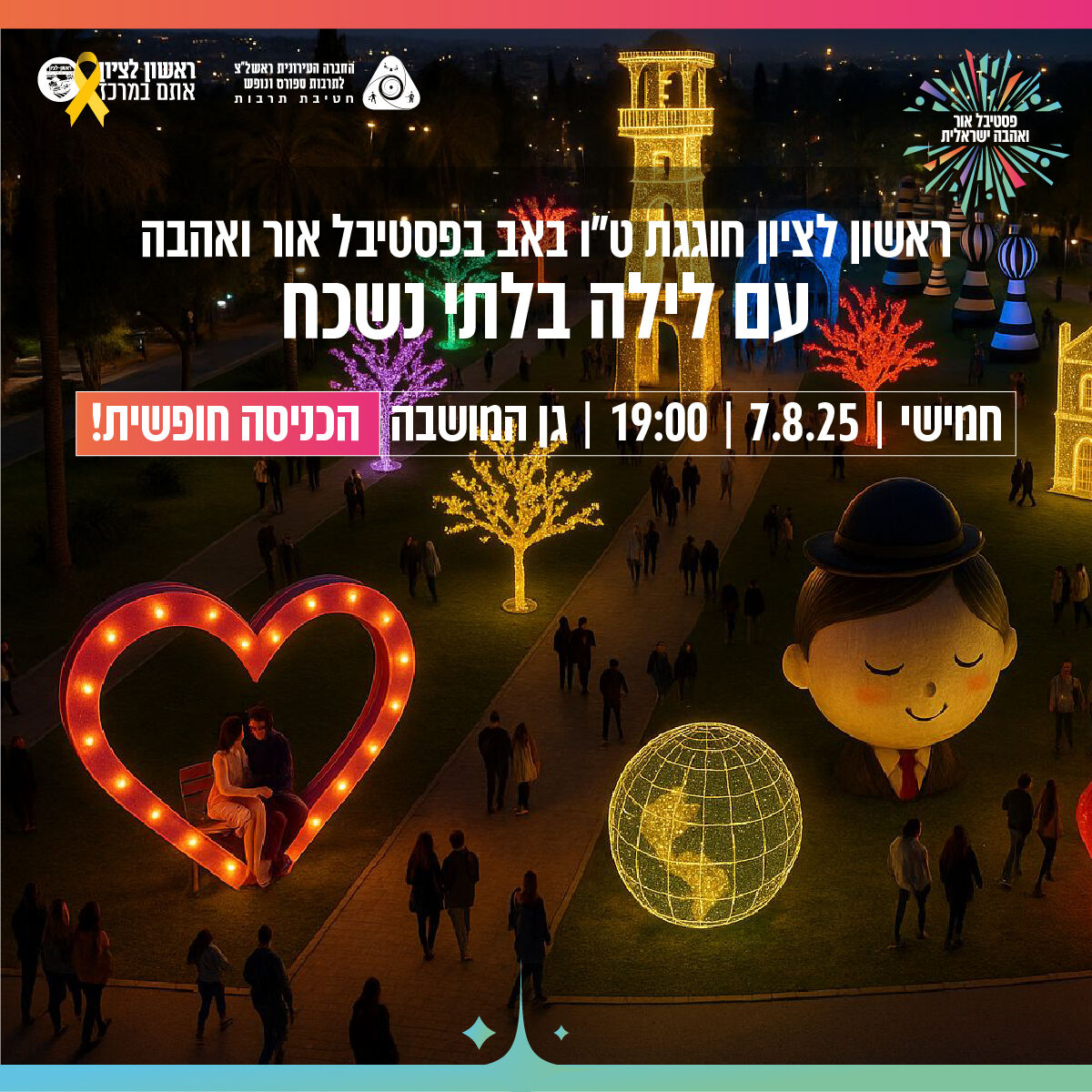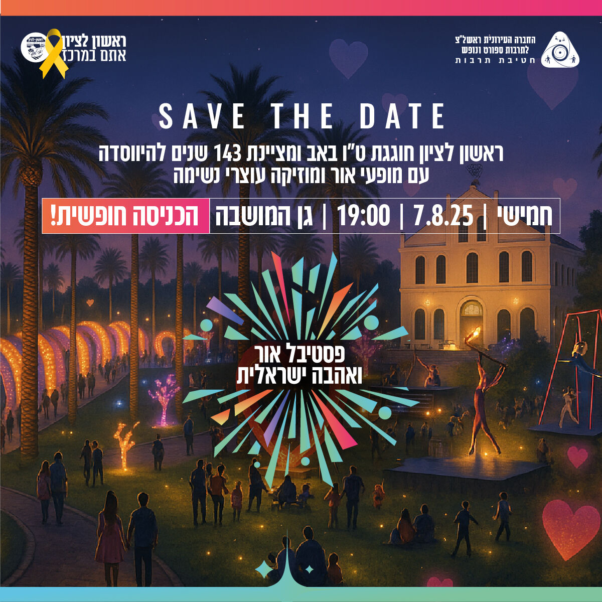 הערב חמישי 7/8 בראשון לציון חוגגים אהבה ו-143 שנים לעיר ראשון לציון ❤️ ט"ו באב בגן המושבה מופע מרכזי "בקצב הלב", מופע קרקס כחול לבן, מופע לייזר מרהיב, מיצגים ודמויות תיאטרליות, הרכבים מוזיקליים חיים, הקרנות ויזואל ועוד. בשעות 19:00–23:00. הכניסה חופשית