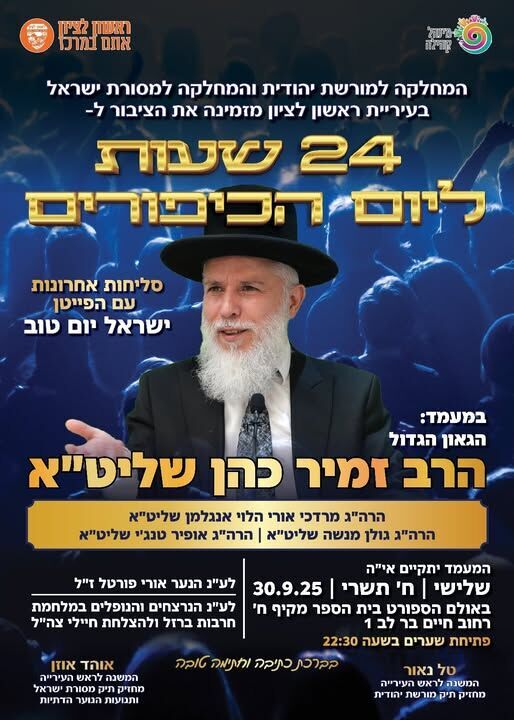 תושבי ראשון לציון מוזמנים למעמד הסליחות האחרונות אשר יתקיים ביום שלישי 30.9 בהשתתפות הרב זמיר כהן והפייטן ישראל יום טוב