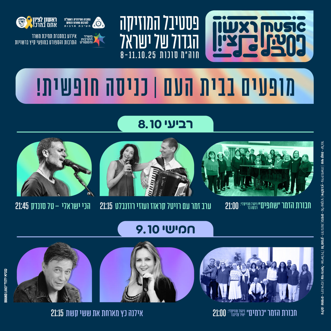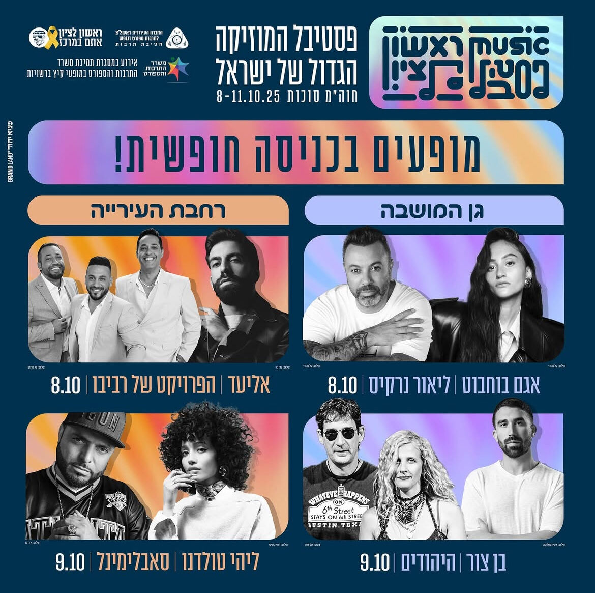 הערב חמישי 9/10 בפסטיבל סוכות בראשון לציון: ליהי טולדנו, סאבלימינל, בן צור והיהודים, ששי קשת ועוד. בנוסף, מתחם ילדים, יריד אמנים, פסטיבל טעמים עם השפים המובילים, יריד יינות. כל האירועים בכתבה