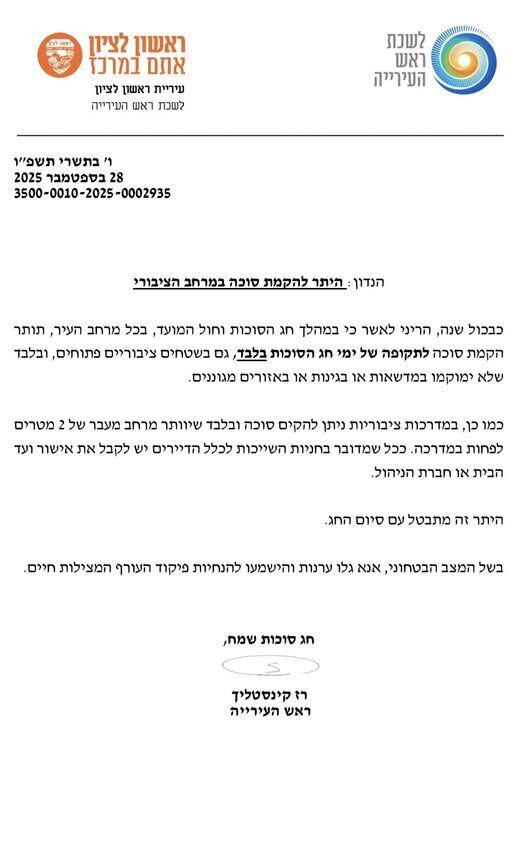 עיריית ראשון לציון פרסמה היתר רשמי המאפשר הקמת סוכות במרחב הציבורי לרגל חג הסוכות. ההיתר יחול בכל רחבי העיר, למשך כל ימי החג.