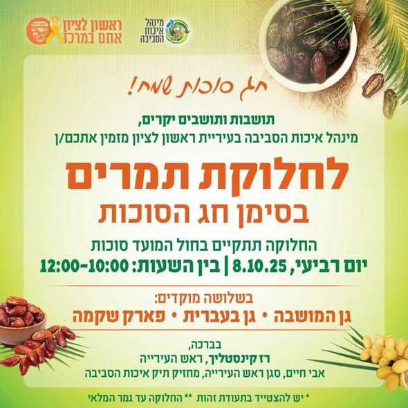 עיריית ראשון לציון מכריזה על מסורת חדשה לקראת חג הסוכות: בנוסף לחלוקת ענפי דקל לסכך, שתתקיים ביום ראשון אחר הצהריים, העירייה תחלק גם תמרים לתושבים.