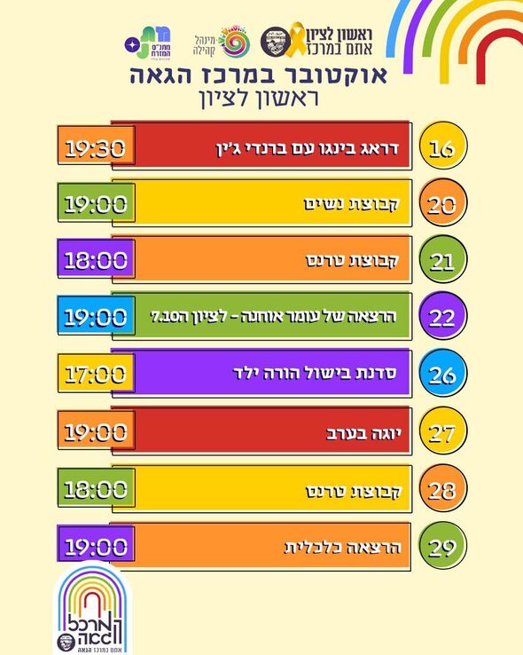המרכז הגאה בראשון לציון מפרסם את לוח הפעילויות המגוון לחודש אוקטובר. כל הפעילויות יתקיימו במרכז הגאה, הממוקם ברחוב גיסין 7 בעיר.