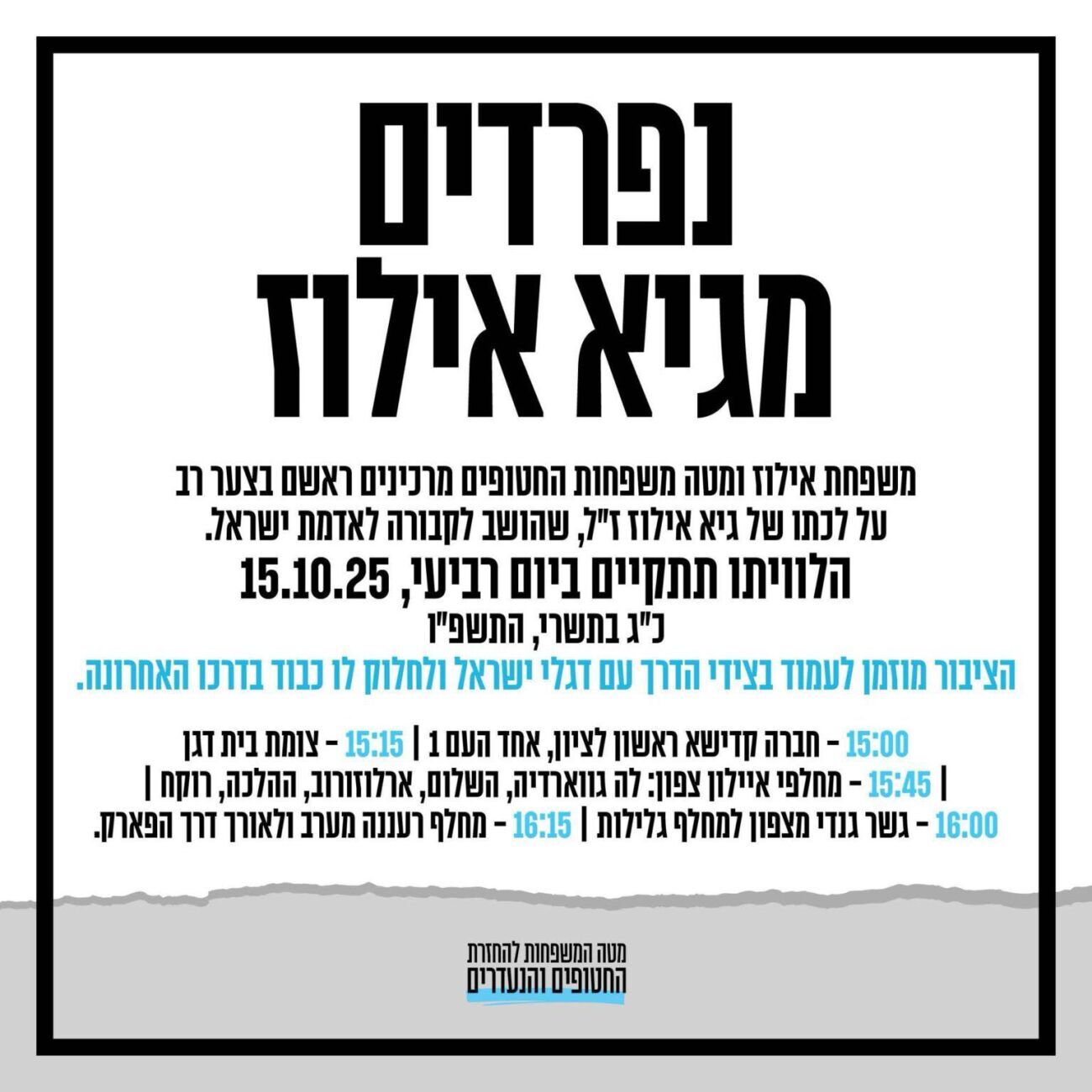 תזכורת: מסע הלווייתו של החטוף גיא אילוז ז"ל, בן 26, ייצא היום בשעה 15:00 מראשון לציון. הציבור מתבקש להגיע עם דגלי ישראל לרחוב אחד העם 1 ולחלוק כבוד אחרון