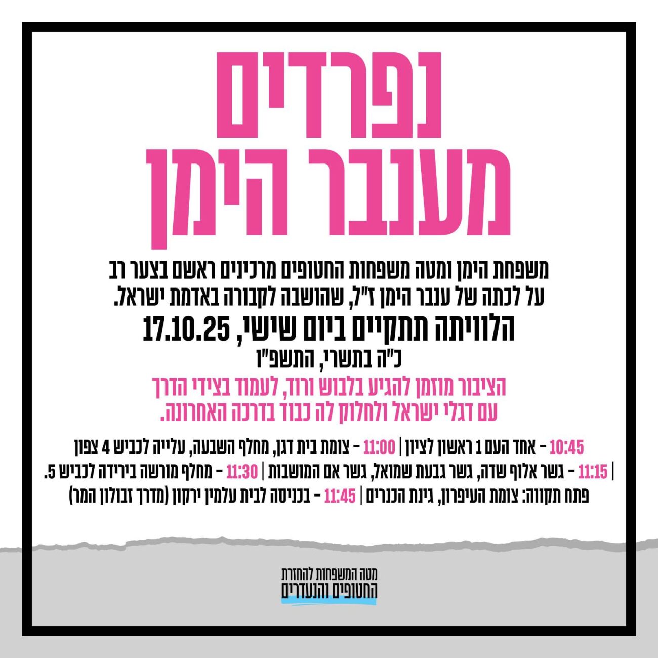 משפחת הימן ומטה משפחות החטופים מזמינים את עם ישראל להגיע בלבוש ורוד, לעמוד לצידי הדרך עם דגלי ישראל, ללוות את ענבר בדרכה האחרונה ולהגיע להלוויה.