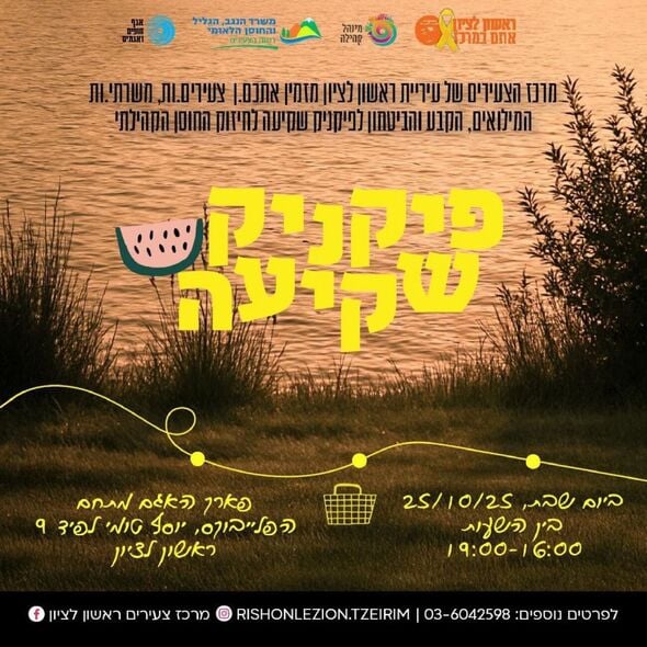 ביום שבת 25.10 מרכז הצעירים ראשון לציון יקיים פיקניק בשקיעה בפארק האגם לצעירים, חיילים, סטודנטים ומשפחות המילואים