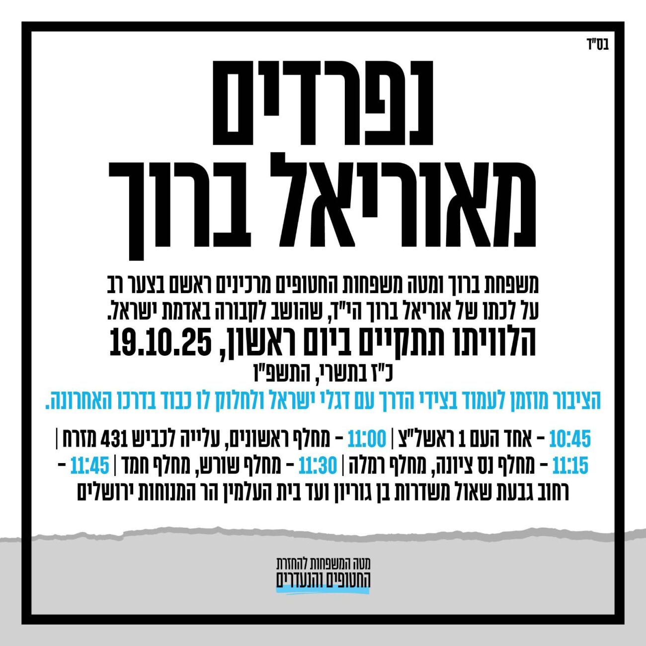 משפחת ברוך ומטה משפחות החטופים מזמינים את עם ישראל לעמוד לצידי הדרך עם דגלי ישראל, ללוות את אוריאל בדרכו האחרונה ולהגיע להלוויה.
