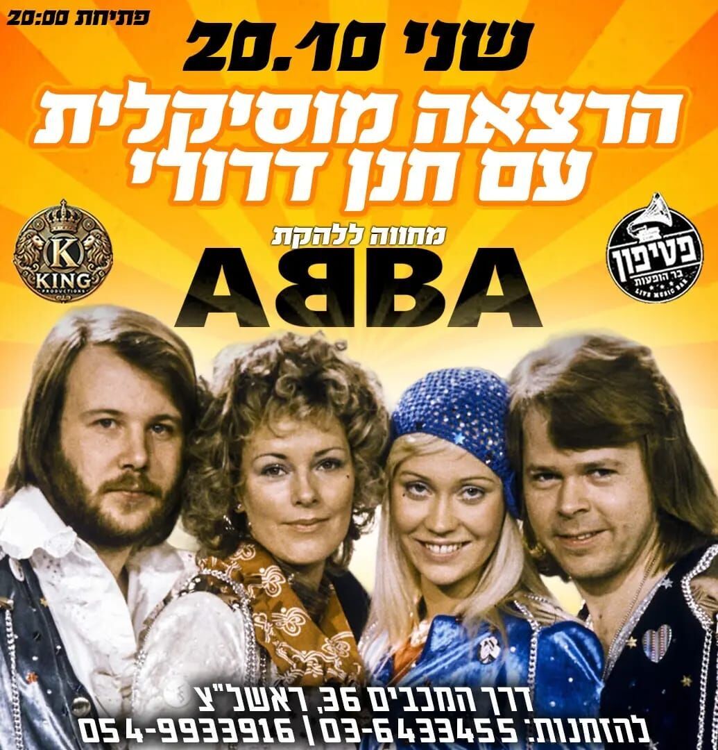 הרצאה מוזיקלית מרתקת על סיפור ההצלחה של להקת הפופ האגדית אבבא, תתקיים בפטיפון בר בראשון לציון. את ההרצאה יעביר חנן דרורי, והיא תלווה בכל הלהיטים הגדולים, קליפים נדירים ומרגשים, ותספר את סיפורה של הלהקה ששינתה את עולם הפופ.