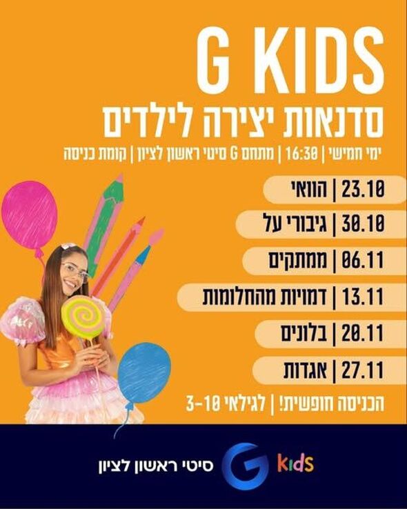 בימי חמישי החל מ23.10 תתקיים פעילות לילדים+סדנה במתחם G ראשון לציון
