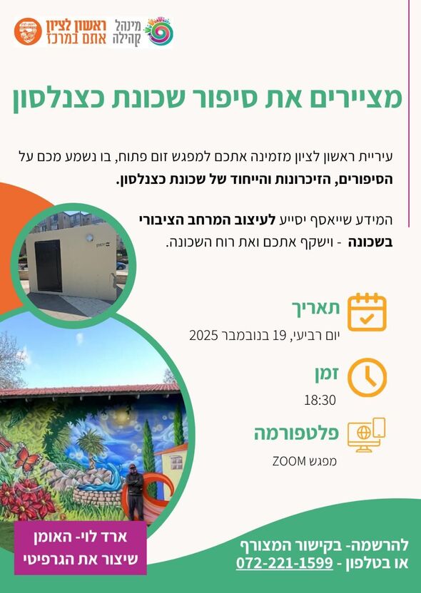 מציירים את סיפור השכונה בראשון לציון: תושבי כצנלסון מוזמנים למפגש זום ביום רביעי 19.11 להשפעה על עיצוב המיגונית החדשה בשכונה