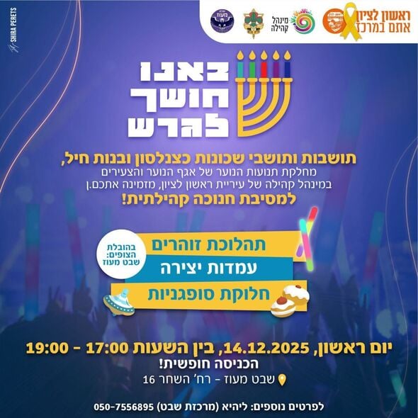תושבי שכונות כצנלסון ובנות חיל בראשון לציון מוזמנים לתהלוכת זוהרים ומסיבת חנוכה שתתקיים יום ראשון 14.12